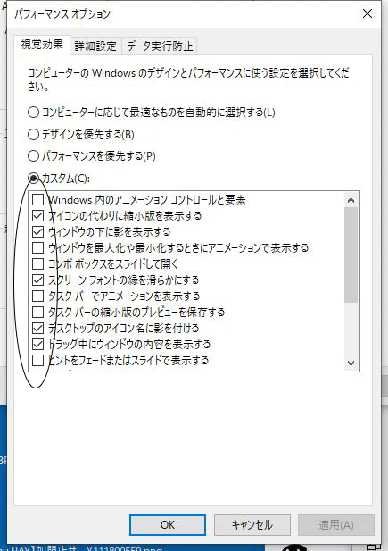 視覚効果から下記のチェックボックスをはずすして”OK”を押して終了するだけです。